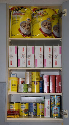 I like to keep our grocery deliveries down to one-a-month which makes it difficult if ever they are out of something (or my personal shopper can't find it). One obvious remedy is to hoard more than a month's worth of staples so that out-of-stock items don't impact the unchanging (and somewhat inflexible) daily menu. Of course one can't really do that with milk and yogurt. Last summer I compensated by walking over to the nearby FreshCo for replacements. With the recent uptick in snow and Omicron, I perceived such a venture as too challenging. So last month I tried a second order, but from a different grocery delivery service. Even that was not able to procure me those big boxes of Bran Buds, so I resorted to asking Amazon for five of them (back on January 27). It was never going to be a fast delivery because (I think) they had to wait on Kellogg's but I still had a couple of big boxes and a couple of small ones on hand, so no problem. Then the Ambassador Bridge blockade made me worry a bit about it. The order arrived today! In the above photograph they are on the second shelf from the top.